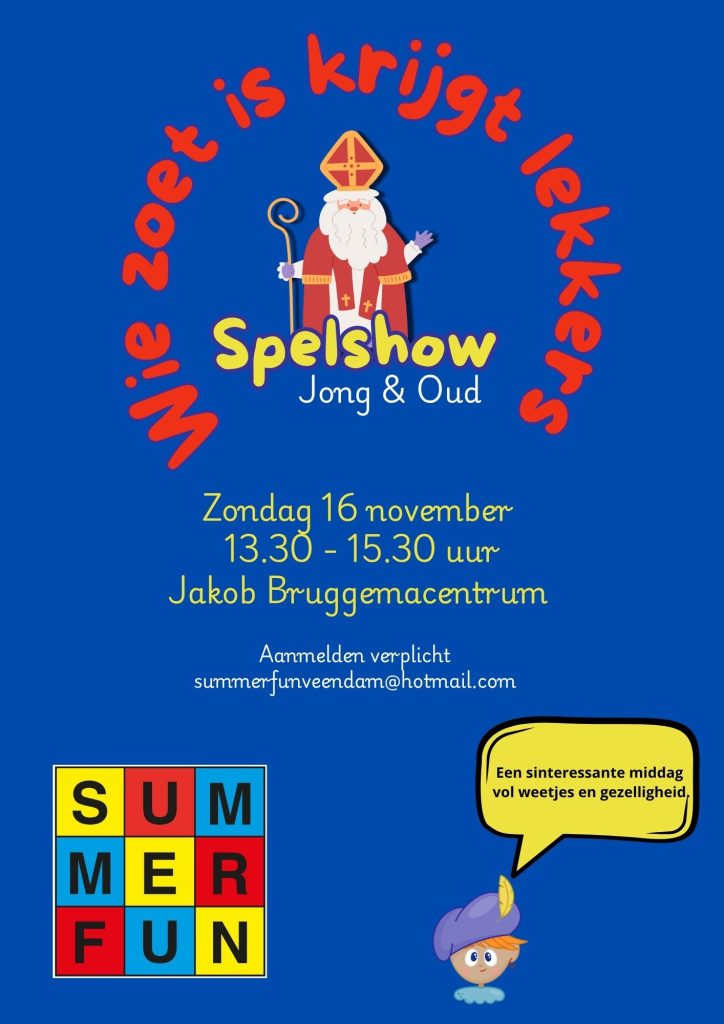 Het is de sinteressante spelshow Wie zoet is krijgt lekkers van Summerfun! Een unieke spelshow waarin de traditionele gezelligheid van Sinterklaas samenkomt in een activiteit voor het hele gezin. Zitten jullie al in spanning? Trippel, trappel, trippel trap? Tijdens deze middag nemen wij jullie mee in alles wat je moet weten over Sinterklaas. We zingen samen, proeven pepernoten, puzzelen en laten onze speculaties de vrije loop. Geen onderlinge wedstrijd met competitie en prijzen, maar een gezellige middag voor het hele gezin met een hoop gezelligheid en lekkers. Sinterklaas rijdt ons huisje voorbij, maar gelukkig hebben wij genoeg creativiteit in huis er een fantastische middag van te maken. Meedoen is gratis! Aanmelden kan door Ozosnel een mail te sturen naar summerfunveendam@hotmail.com o.v.v. namen/leeftijd kinderen en aantal volwassenen.